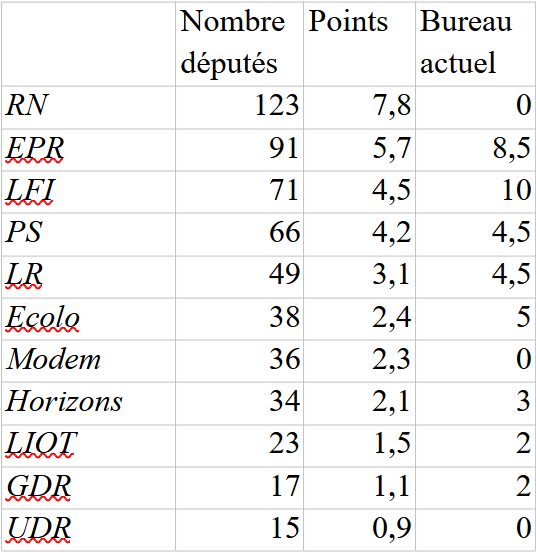 En 2024, les élections avaient été un fiasco pour le socle commun. Pour composer le bureau, on se réfère à un système de 35,5 points, où les postes les plus importants (présidente 4 points, 3 questeures 2,5 points chacune, 6 vice-présidents 2 points) valent plus que les douze secrétaires (1 point). Si les groupes ne s’accordent pas, on passe au vote, mais ces points restent un référentiel.